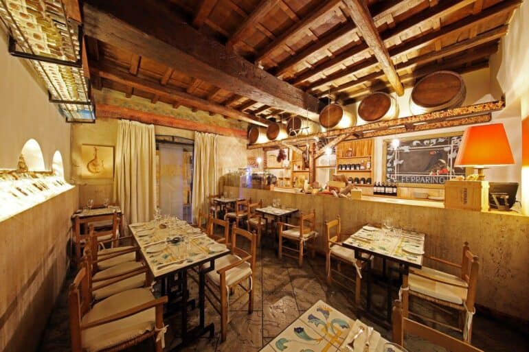Rimessa Roscioli è un famoso locale tra Campo de’ Fiori e Trastevere, un luogo che vi attende per farvi vivere un’esperienza di wine tasting completamente nuova. Da un calice al volo fino a una degustazione personalizzata da 500 euro, da Rimessa Roscioli gli appassionati di vino ad ogni livello possono provare tanti tipi di esperienze diverse e scoprire la storia, le origini e le caratteristiche dei vari produttori. A prima vista il locale ha un aspetto rustico: le luci sono suffuse, e creano un’atmosfera romantica, i sommelier ti accolgono calorosamente, e puoi anche sbirciare nella cucina all’aperto, e vedere il cuoco mentre affetta il prosciutto e impiatta la burrata fresca, prodotta quella stessa mattina. La lista dei vini potrebbe mandare fuori di testa anche i conoscitori più esperti. Il menù infatti comprende sia i vini tradizionali che quelli organici, e può essere condiviso o in una cena di coppia o durante una degustazione di vini con più persone.