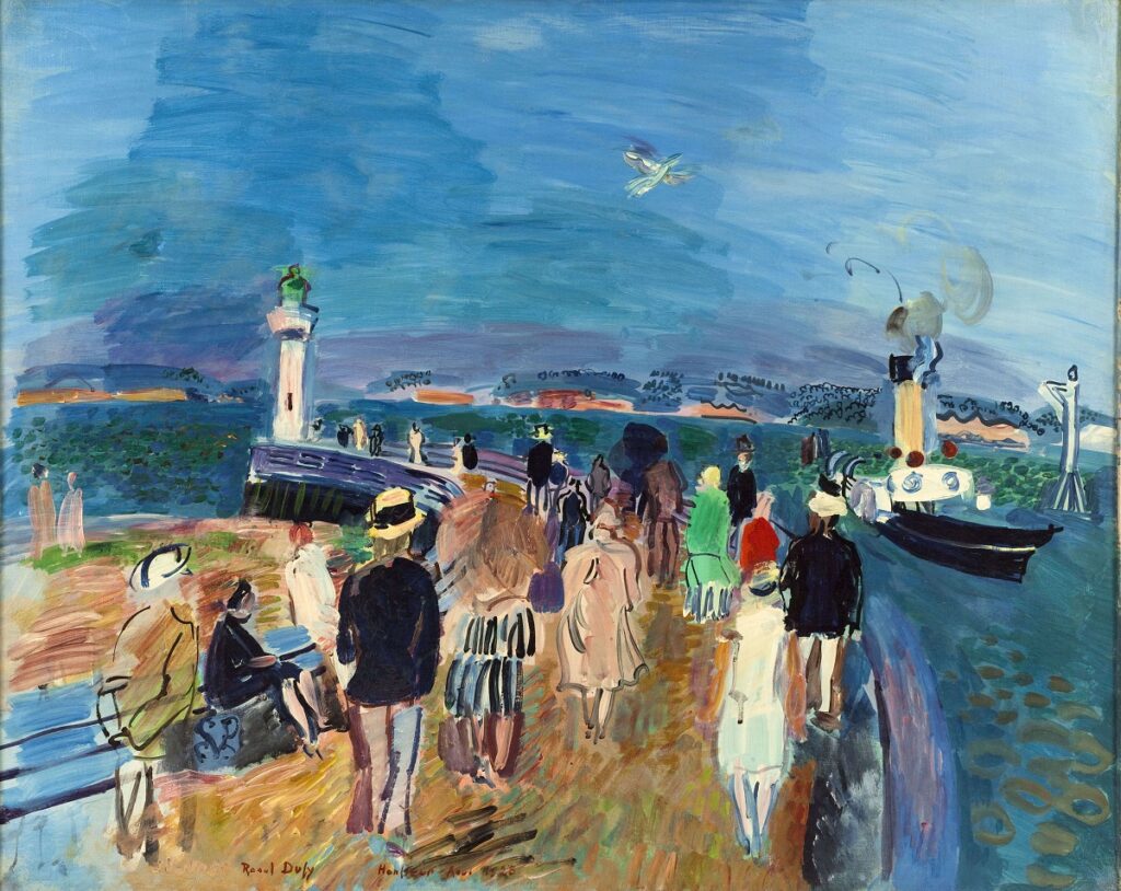 I Fauve (le “Bestie, letteralmente”) scelgono il colore, e lo scelgono in modo spregiudicato, libero, emotivamente graffiante. Che sia brillante, e che illumini, oltre a far sentire la sua presenza, questo è ciò che contraddistingue il loro stile. Dufy si allinea a questa visione, creando un effetto a tratti sinestetico: il blu degli elementi aerei e acquatici della tela Il molo di Honfleur sembra gridare della voce del gabbiano in volo nel cielo, mentre il grigio del fumo che esce dalla cimiera del vaporetto arriva alle narici dello spettatore inondandole di fuliggine.