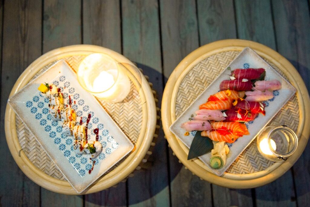 Per cena, il menu del Ristorante Japanese & Fusion si divide in due parti: da un lato segue la tradizione nipponica, messa in pratica con un particolare trattamento del pesce che viene lavorato non appena arriva nel locale, “purificato” con sale o con soluzioni saline a seconda della provenienza, seguendo una pratica orientale, la stessa che si usa nella costruzione dei piatti. Dall’altra parte, invece, presenta piatti fusion realizzati con ingredienti e ricette provenienti da tradizioni culinarie diverse. Preparatevi a gustare ottimi ravioli giapponesi (con carne, pesce e vegetariani), nigiri, hosomaki, uramaki, veggie roll, temaki e sashimi, tartare di salmone con avocado e salsa ponzu, cevice di spigola, hamburger di Wagyu e Salmon Tandori, cotto al forno e marinato con spezie e latte di cocco.