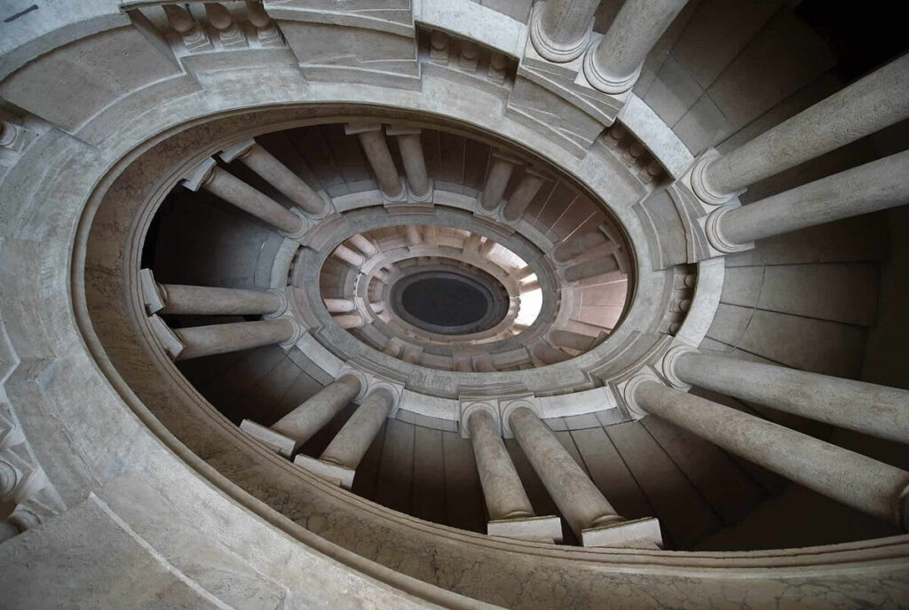 Questa splendida scala elicoidale è il capolavoro dell’architetto Ottaviano Mascarino: sorretta da coppie di colonne in travertino è caratterizzata da magnifici effetti chiaorscurali derivanti dalla luce naturale che scende dall’alto nel pozzo centrale. Da questa scala Borromini trasse ispirazione per realizzare la sua famosa scala presente all’intento di Palazzo Barberini a Roma.